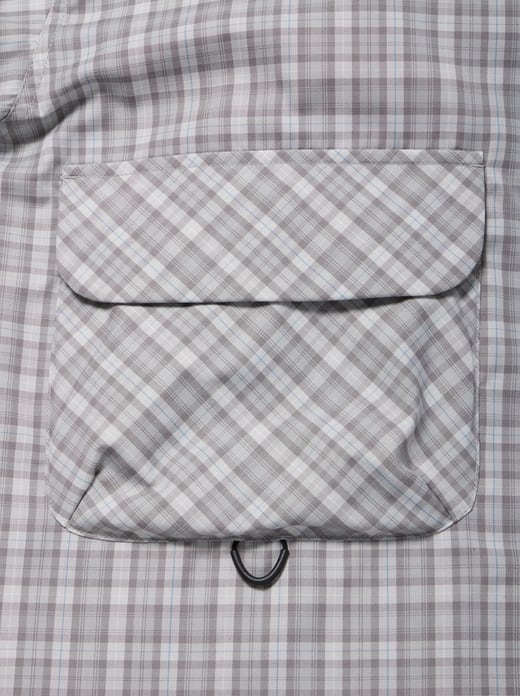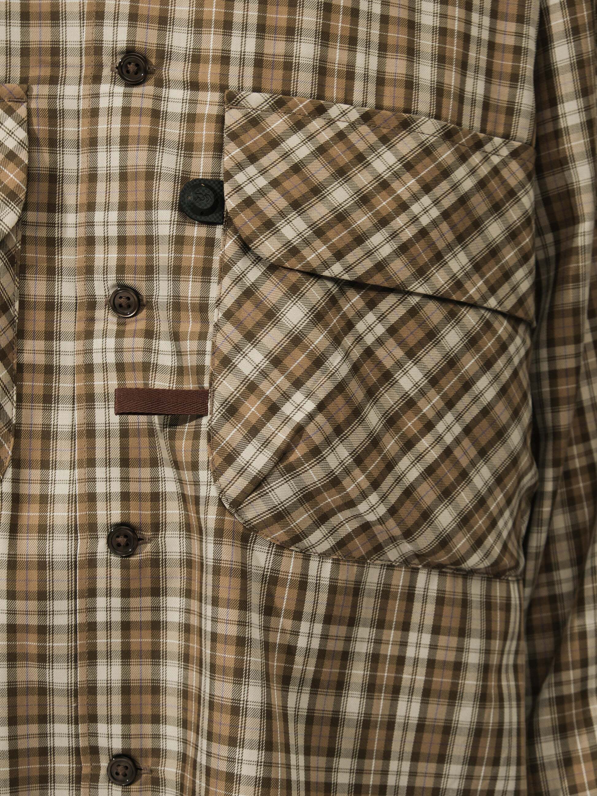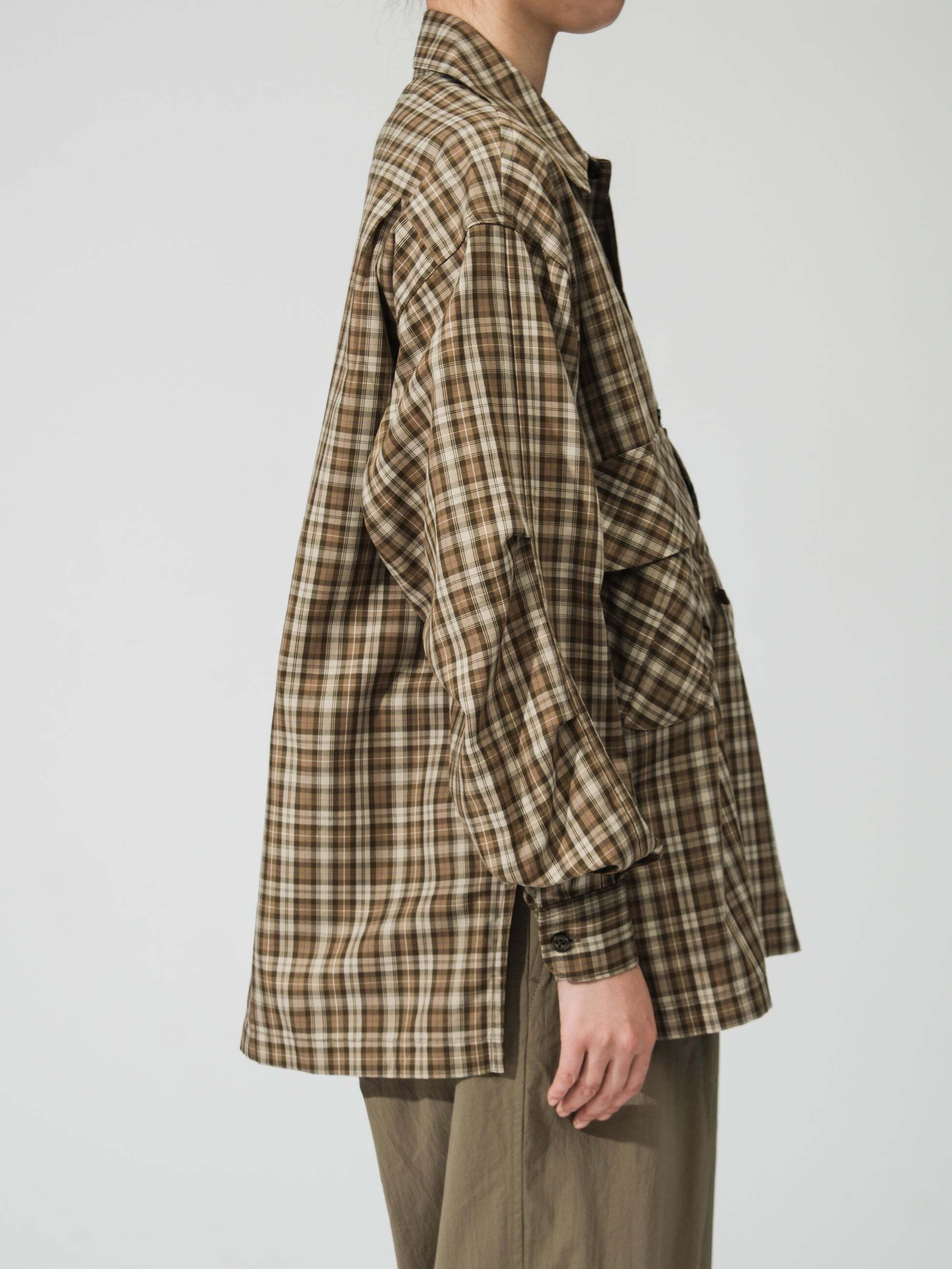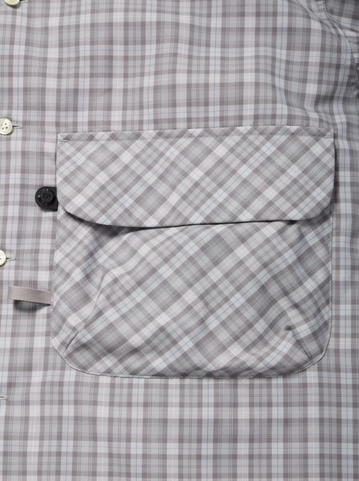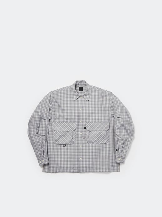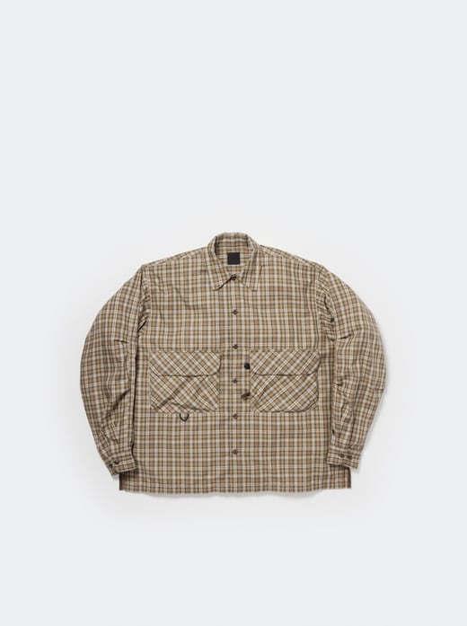 50年代のクラシックなオープンカラーシャツをアレンジしたアイテム。特徴ある丸みを帯びたフラップポケットは横長にアレンジし、フィッシング仕様にアップデート。左右でインナーポケットのデザインを変えているため、機能的なマルチポケットに昇華。ミリタリーのディテールでもある前振りの袖がデザインアクセント。アクションプリーツを加えてデザイン。サングラスホルダー付き。