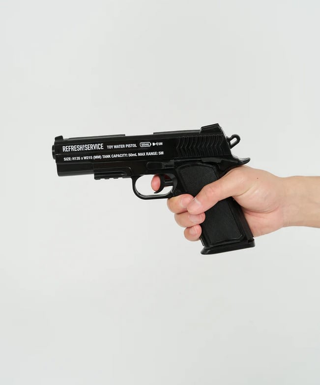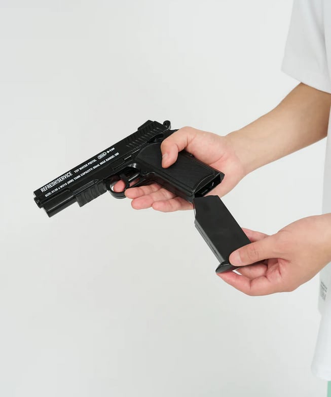 最大5メートルの飛距離を誇る、軽量プラスチック製のウォーターピストル。ボディには“REFRESH!SERVICE”のロゴを大胆にプリントし、ユーモアと存在感を兼ね備えたデザインに。リゾートやアウトドアイベントでのリフレッシュタイムをよりアクティブに彩ってくれるアイテムです。