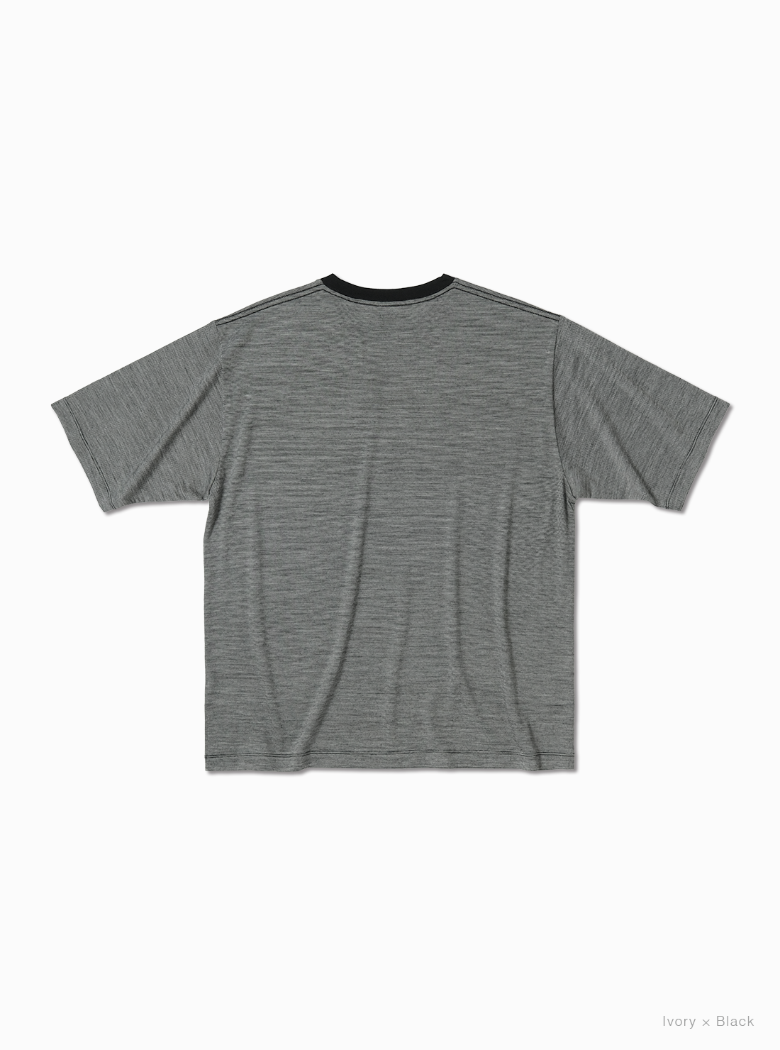 様々な視点からサマーウールTシャツに最適な番手とクオリティを追求し、バランスの取れた生地を開発しました薄手で軽やか、肌離れがよく滑らかに落ちるドレープが特徴。着丈・袖丈はやや長めのデザイン。衿元はタコバインダー仕様。