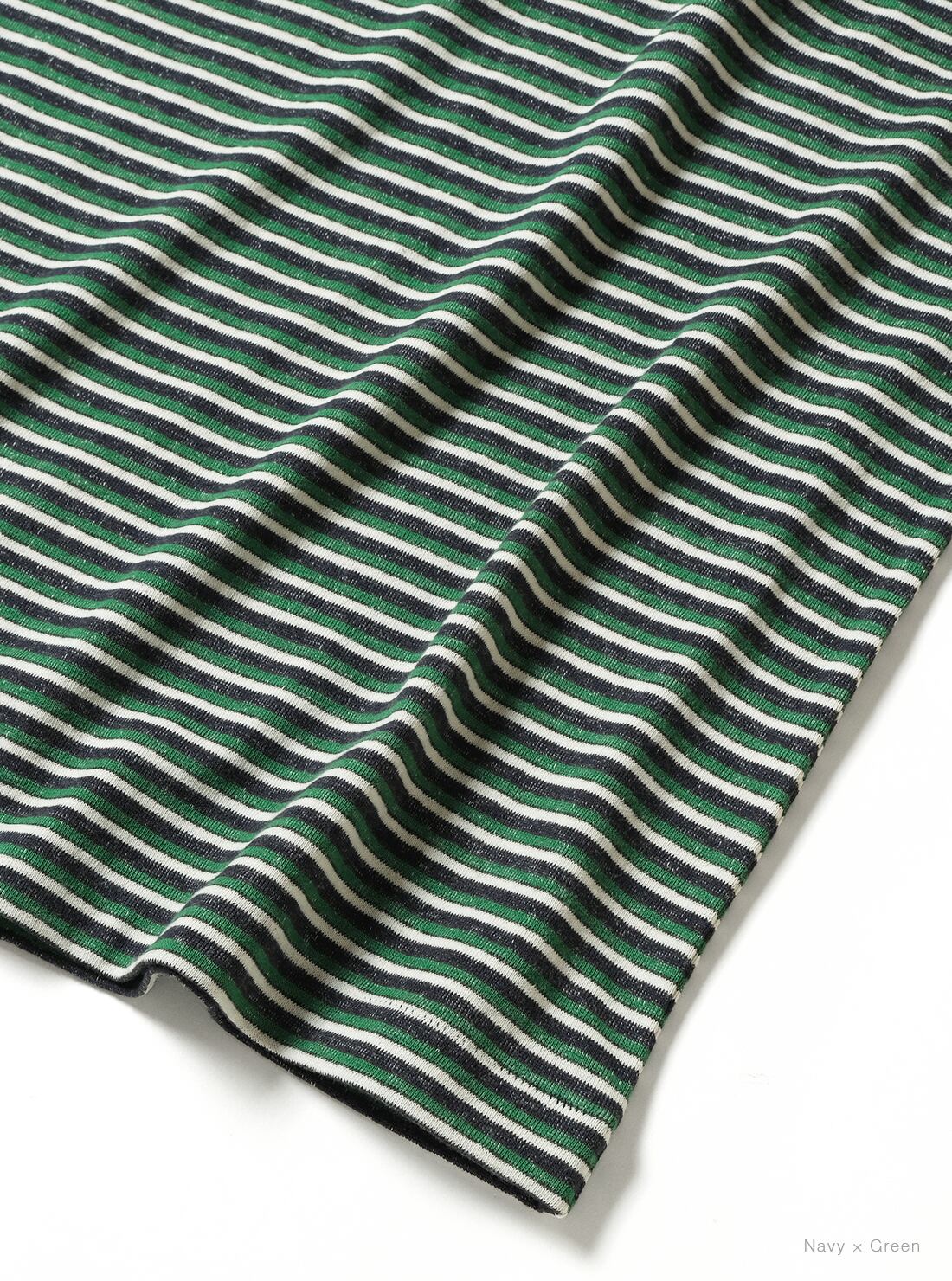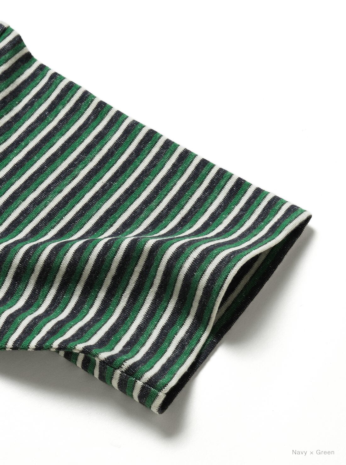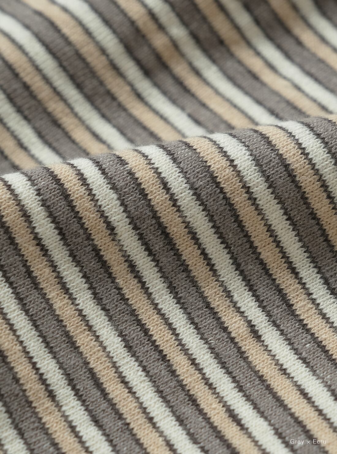 リサイクルコットンの落ワタを使用し、ブレーディングでボーダー柄に編み立てた生地を使用。裏面の白糸が表にうっすらと透けて見えるように編むことで、ソフトで優しい肌触りと、ヴィンテージのような雰囲気を兼ね備えた商品です。袖口、裾部分はシングルステッチで仕上げ、衿元はタコバインダー仕様。