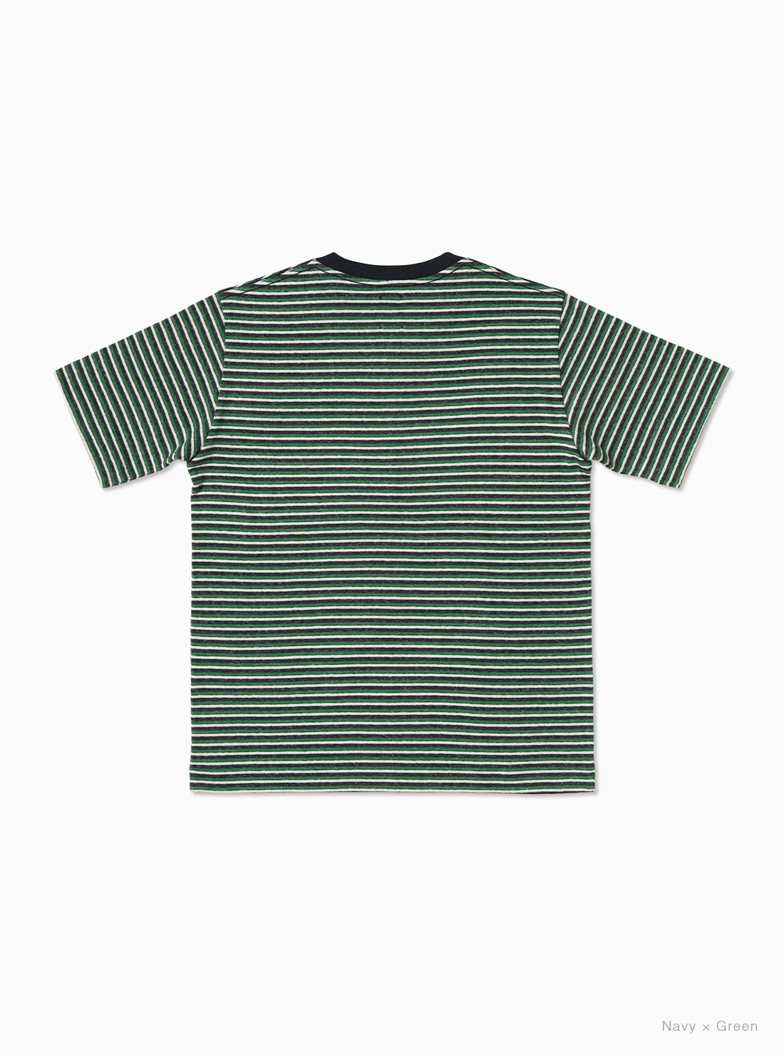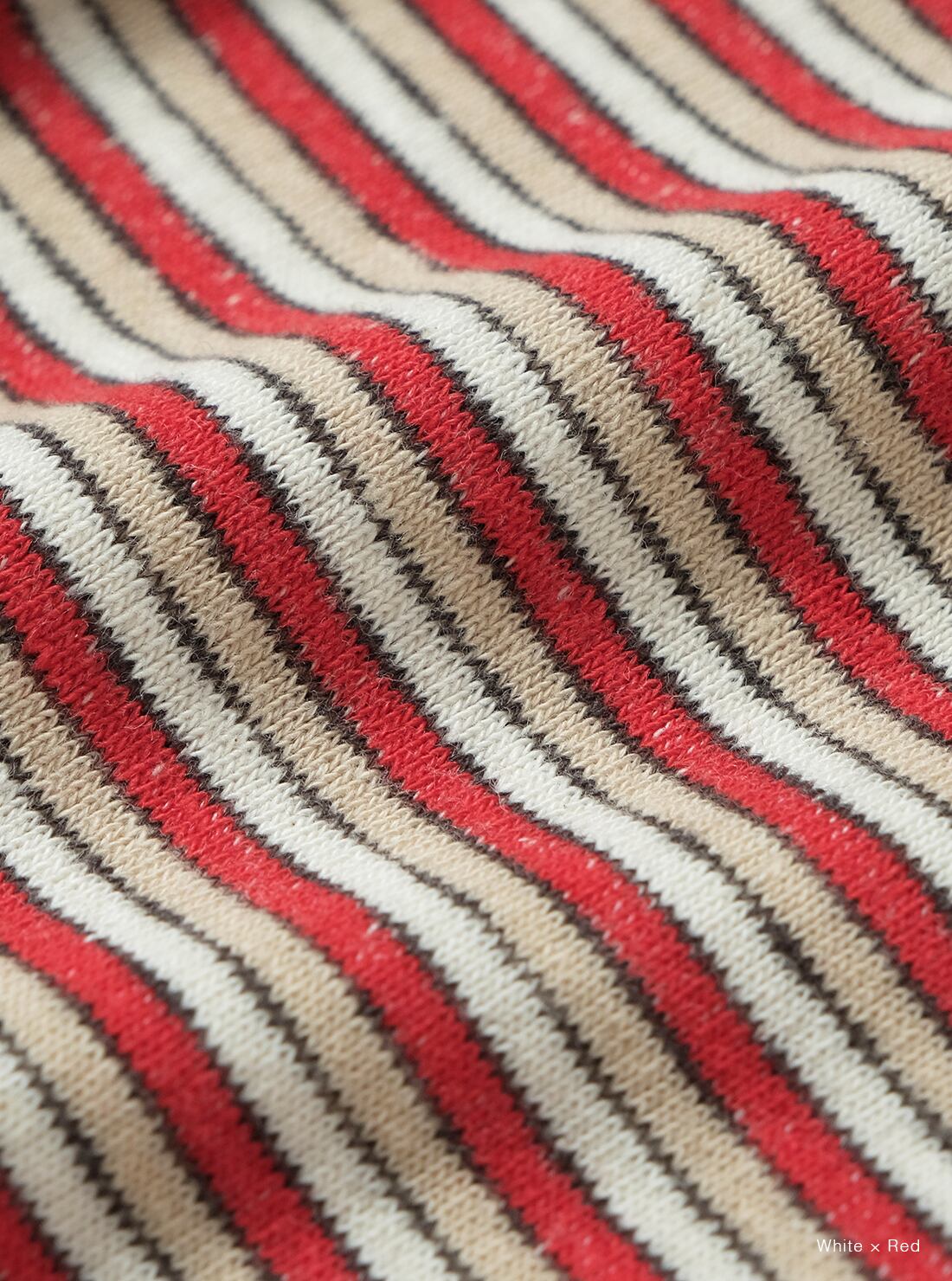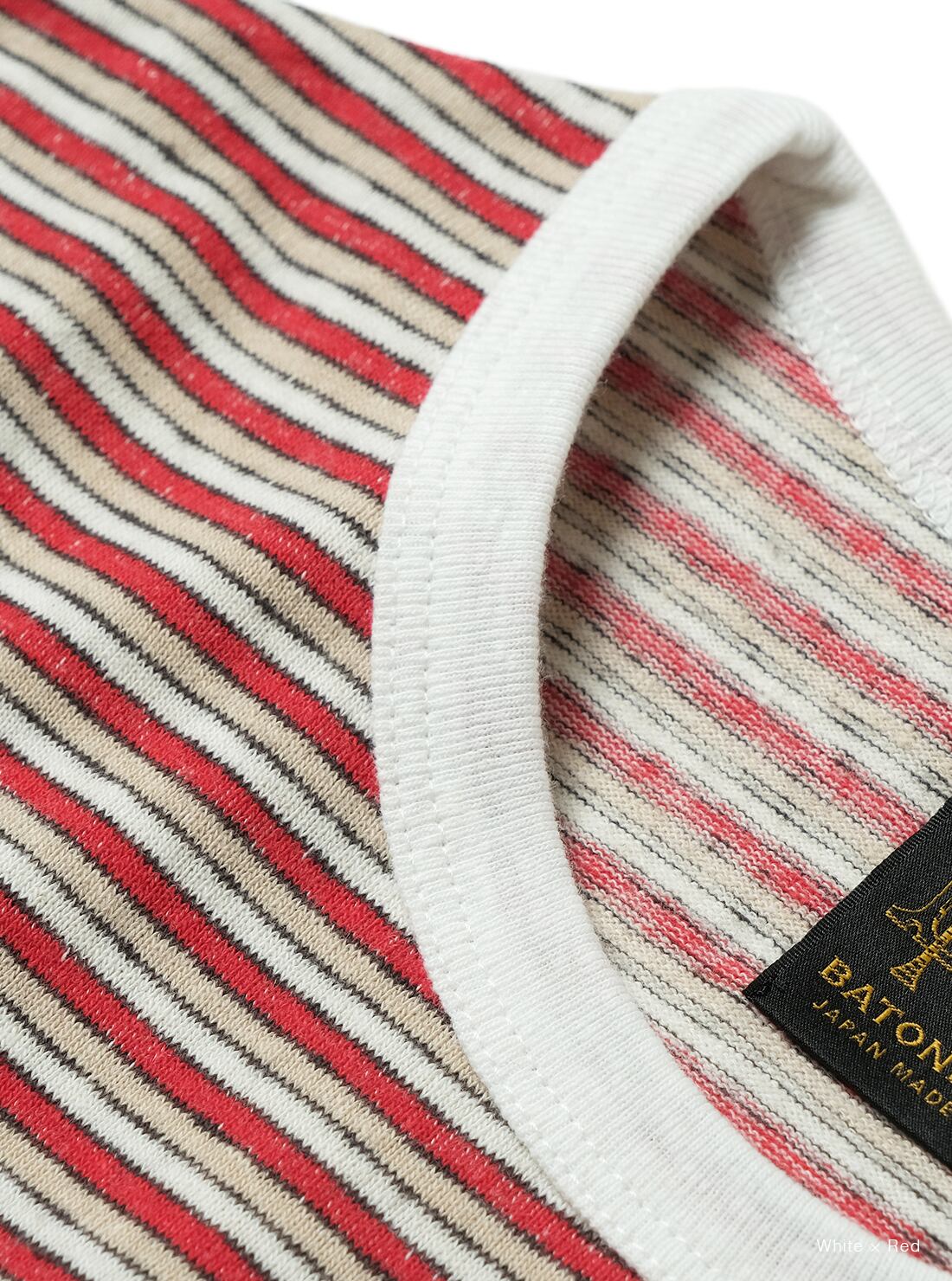 リサイクルコットンの落ワタを使用し、ブレーディングでボーダー柄に編み立てた生地を使用。裏面の白糸が表にうっすらと透けて見えるように編むことで、ソフトで優しい肌触りと、ヴィンテージのような雰囲気を兼ね備えた商品です。袖口、裾部分はシングルステッチで仕上げ、衿元はタコバインダー仕様。