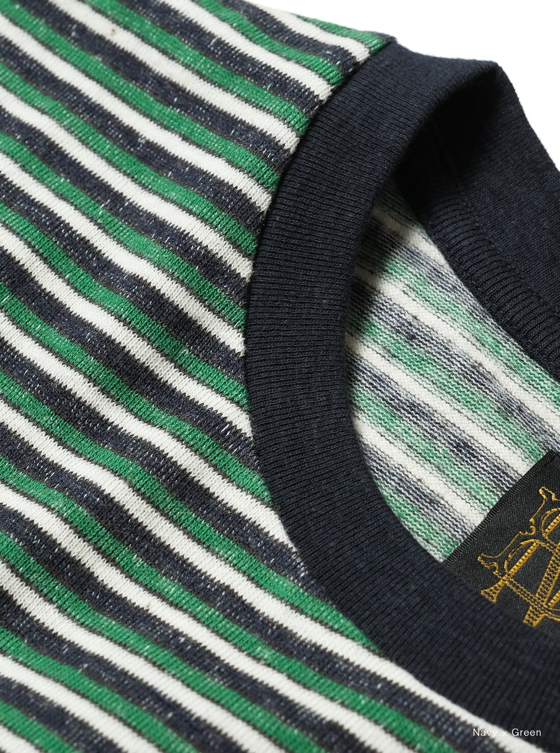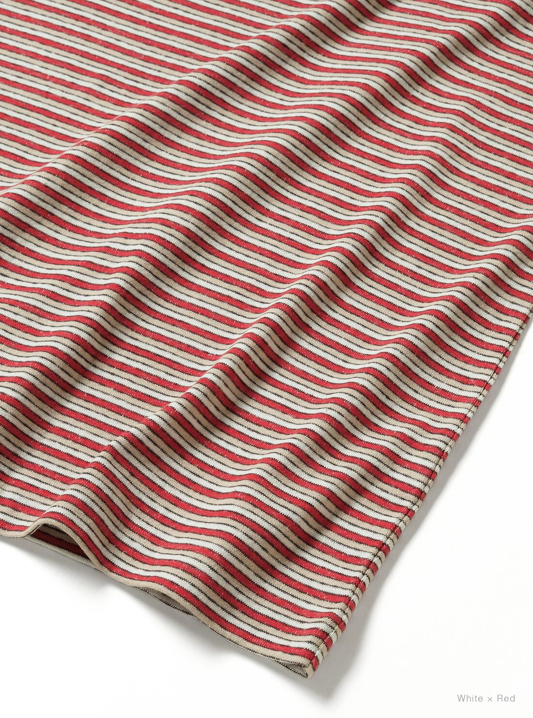 リサイクルコットンの落ワタを使用し、ブレーディングでボーダー柄に編み立てた生地を使用。裏面の白糸が表にうっすらと透けて見えるように編むことで、ソフトで優しい肌触りと、ヴィンテージのような雰囲気を兼ね備えた商品です。裾部分はシングルステッチ仕様。