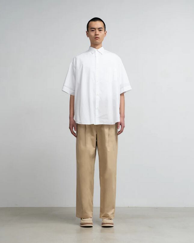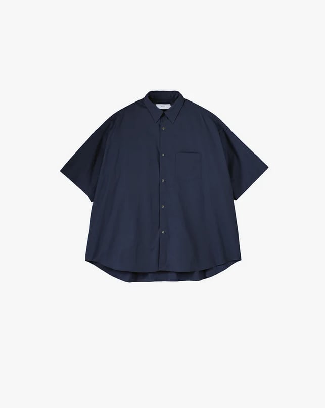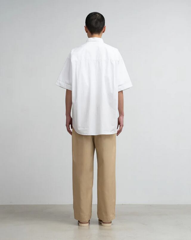 肩の傾斜や低く下げられたヨークの位置、アームホールの広さなど細かなディテールを特異なバランスで仕上げた、ドロップショルダーのボリュームあるボックスシルエットが特徴のオーセンティックなレギュラーカラーショートスリーブシャツ。なめらかに整った繊維そのものの光沢と、均一な撚りによる毛羽立ちにくさを備えた超長綿スーピマコットンを使用し、非常に繊細な糸番手で製織したブロード生地を採用。高級シーツにも用いられる適度なハリと柔らかさを持ち、快適な着心地に仕上げています。